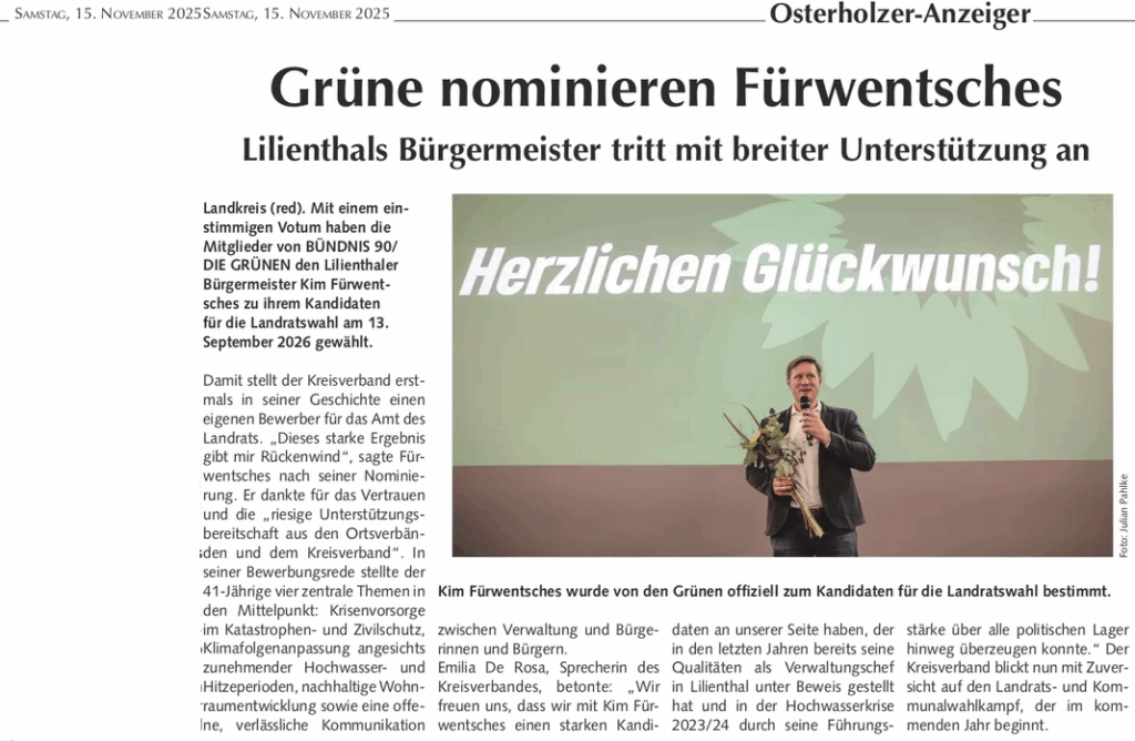 Grüne nominieren Fürwentsches 15. November 202524. November 2025 Artikel am 15.11.2025 Osterholzer Anzeiger
