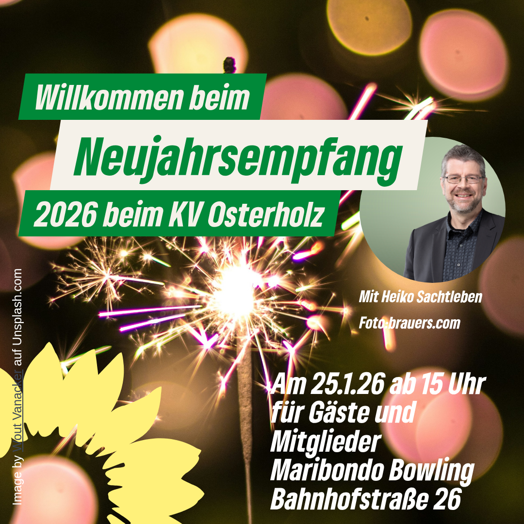 Grüner Neujahrsempfang Neujahrsempfang mit Heiko Sachtleben. Sonntag25.01.202615:00 - 21:00 UhrMaribondo-FreizeitcenterBahnhofstr. 26Osterholz-Scharmbeckorganisiert von BÜNDNIS 90/DIE GRÜÜNEN OV OHZDownload als ics-Datei